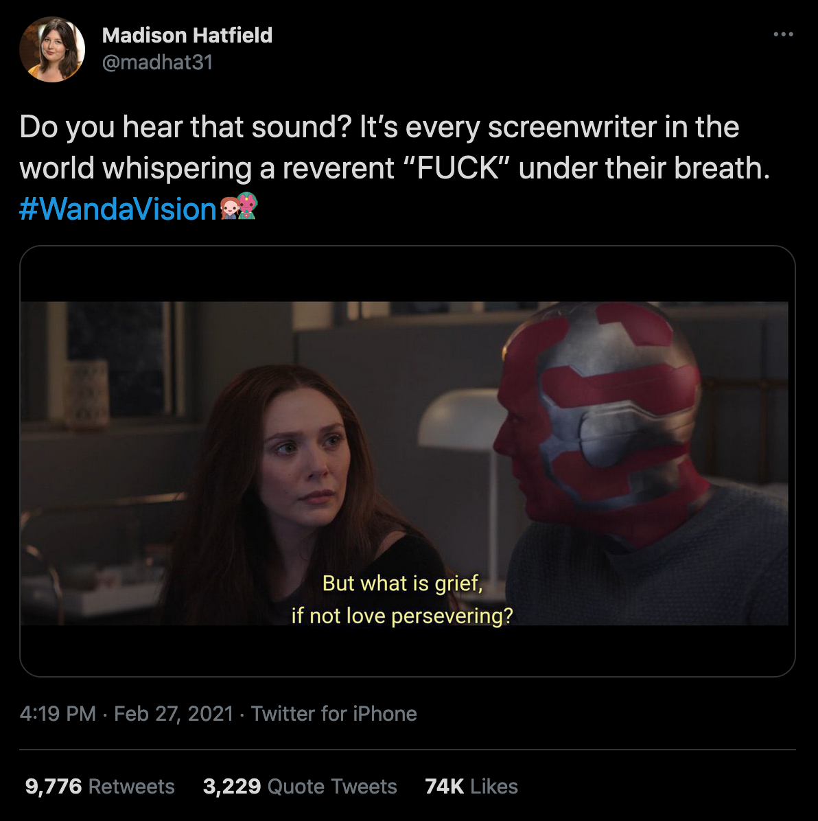 Some context surrounding my perspective: I don’t know exactly what Wanda Vision is, but from what I’ve gathered, it’s a TV show based on a comic book, and it’s a little weirder than your average superhero movie. Like most things on Twitter, it appears3 to have a respectable legion of enthusiasts, who are countered, to a man, if not by people who actively hate it, then by people who think it’s hackneyed and mediocre.